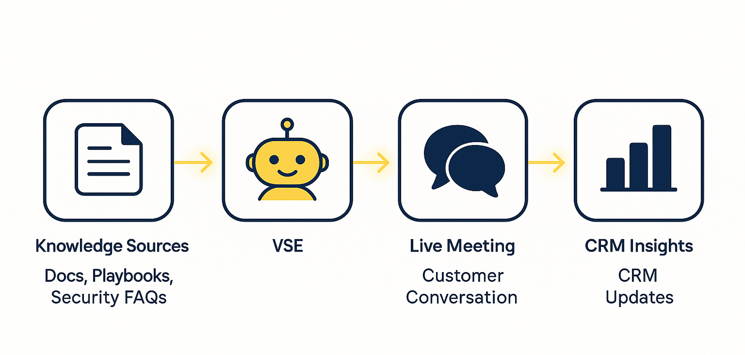 Deployment is fast and low-lift. Virtual SE integrates seamlessly with your existing meeting platforms and knowledge systems—no engineering work required. Most teams are up and running shortly after connecting their content sources.